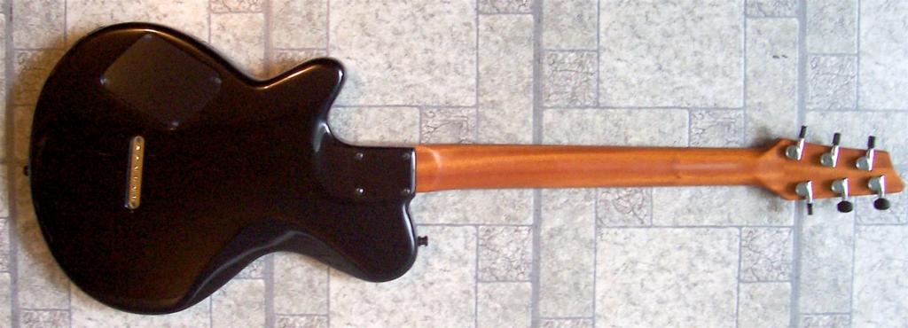 It superficially resembles Eddie Van Halen's designs for his Ernie Ball Music Man EVH (now known as the "Axis": site, reviews) and Peavey Wolfgang (manual PDF download, reviews) signature guitars. Yet I found it more appealing than those two instruments, which I don't like much. (I sure don't play like Eddie Van Halen either.)